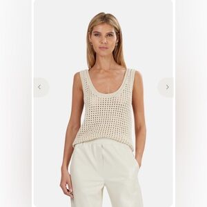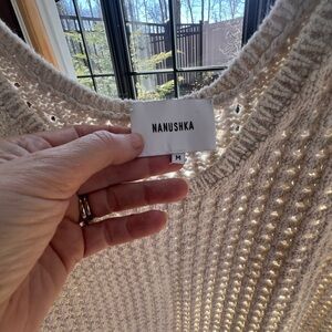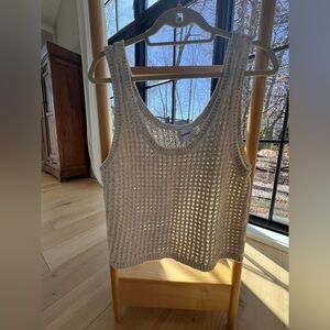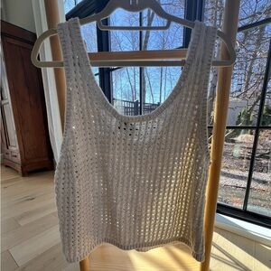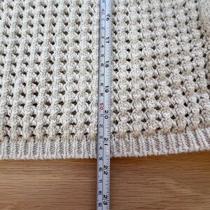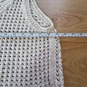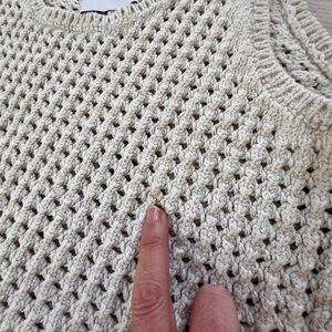 Chic cream knitted tank top. I’d say it’s oversized, easily fits large. There is a very small mark shown where my finger is, very hard to see but it’s there, never noticed it till I was doing the inspection. Tag is also loose on one side. In really great loved condition.