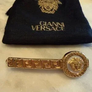 This is a gold-tone GIANNI Versace Medusa hair pin featuring a raised Medusa medallion framed by the signature Greek Key