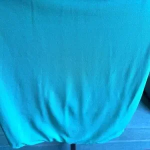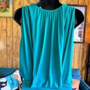 Sleeveless dress with soft gathers at the neckline. Smooth, lightweight stretchy fabric with fluid drape. Vibrant teal tone for versatile styling.