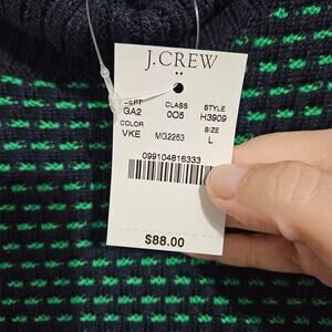 NWT! J. Crew Textured Blue/Green Turtleneck Womens Sweater. Size Large. Long sleeves with ribbed cuffs. Ribbed hem and turtleneck. Navy with green stitching. Made of 60% acrylic and 40% nylon. Heavy and warm.