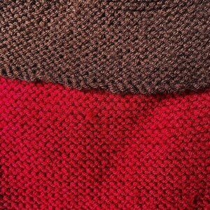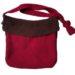 Hand knit crossbody shoulder bag with two small inner open pockets. Burgundy front, brown back with flap that goes over the front. Tan inner pockets. The strap has stretch to it especially with items in the purse. Adjustable strap by tying a knot . Note: after years of strap in a knot the material was flattened out.