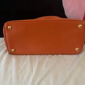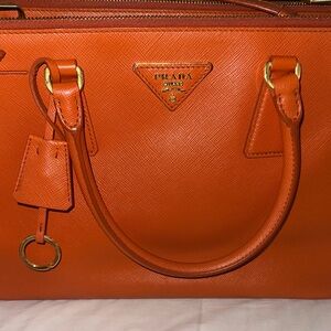 Chic Prada satchel in vibrant orange. Sleek design with gold-tone accents. Ideal for stylish outings, color and hardware still vibrant, minor tarnish on zipper pull, no noticeable rubbing, inside is clean, only call out is the lock on one side that had a cut affecting its closure cinch in that side but does not affect the look, no signs of scratches, straps in very good condition, 8/10 because of the disclosed call out and shown on picture, otherwise great condition, final sales