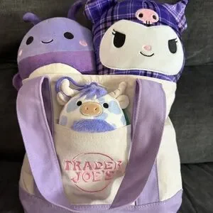 Trader Joe’s viral soft canvas tote (mini) in lavender and pink. These are the perfect Easter basket gifts, they are durable, reusable and the colors are perfect for spring! Most of the squishmallows in this basket are older rarer ones from 2022-2024. They all have their tags in mint condition.