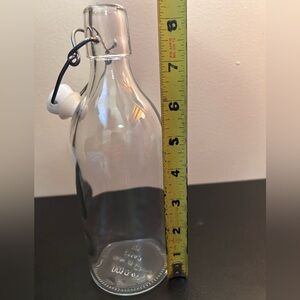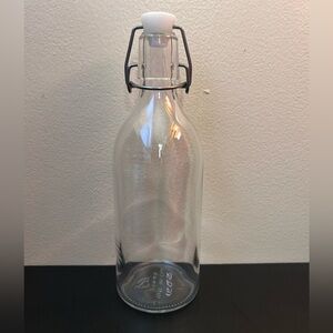 Transparent glass bottle with a secure metal swing-top closure. Simple, versatile storage for liquids and dressings. Clean minimalist design fits modern kitchens.