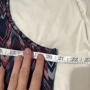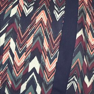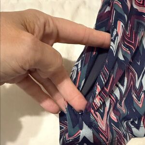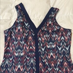 Stylish chevron dress with a sleeveless design. Perfect for casual wear. Features navy and pink hues, A-line shape with small ID/key pocket with hidden zipper near right hem.