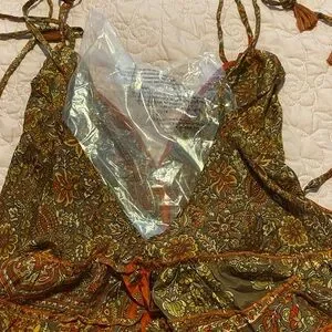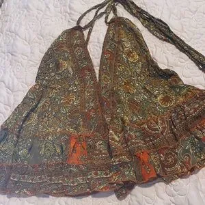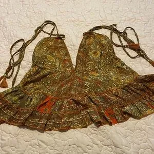 Lightweight boho cami top with paisley print. Features adjustable halter ties and a flattering ruffle hem. Brown and rust colors create a warm, versatile look. Perfect for casual layering or summer outings.