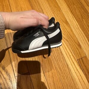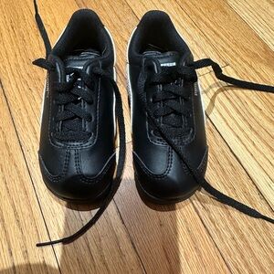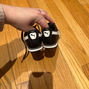 Junior low-top sneakers with classic Puma stripe. Soft padded collar for comfort. Lace-up closure for a secure fit. Rubber outsole for everyday traction. Clean black and white style for easy pairing.