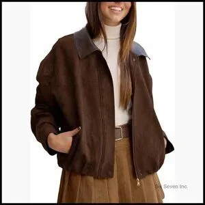 Faux Suede Bomber Jacket Oversized Cropped Zip Up Casual Outerwear