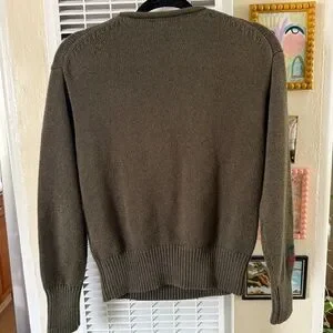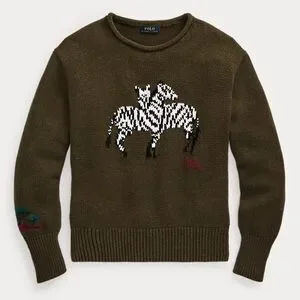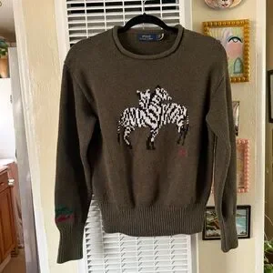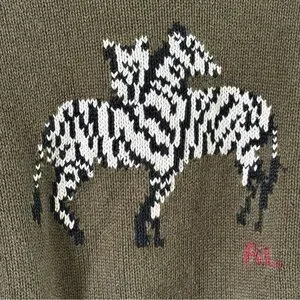 Rare olive green Polo Ralph Lauren rollneck pullover knit sweater. Adorable front zebra intarsia knit design. Cotton blend. Ribbed knit trim. Very good condition! A little very faint minor general pilling. Crafted from a soft blend of cotton and linen yarns, this rollneck jumper showcases a safari-inspired zebra graphic and our signature knit red monogram logo on the front. Length 23”. Bust flat across 18.5”.