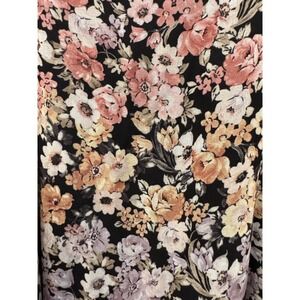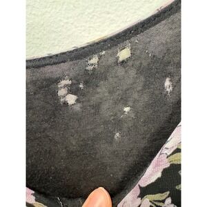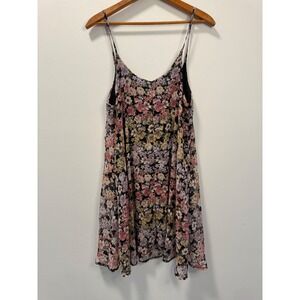 Brandy Melville floral mini dress in a dark romantic aesthetic. This lightweight piece features a delicate pink, purple, and cream floral print over a black base, complete with adjustable spaghetti straps and a soft V-neckline. The flowy silhouette offers a relaxed fit, perfect for layering or wearing solo during warmer months.