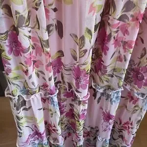 Lightweight pink floral midi dress with long sheer sleeves and elasticated waist for a comfortable fit. Delicate ruffle tiering and an all-over pink and green floral print for a feminine, romantic look. Easy to style for daytime events and special occasions.