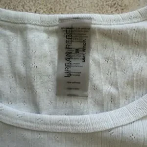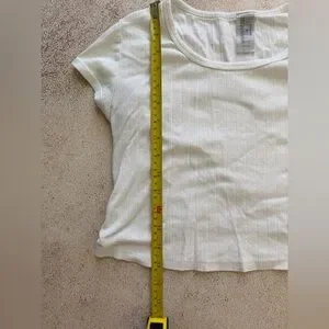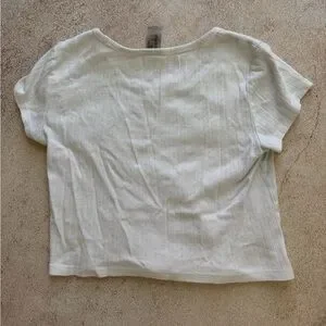 Lightweight white scoop neck tee with short sleeves. Soft, breathable knit for everyday comfort. Subtle textured stripe detail adds understated style. Easy-to-style wardrobe staple for versatile looks.