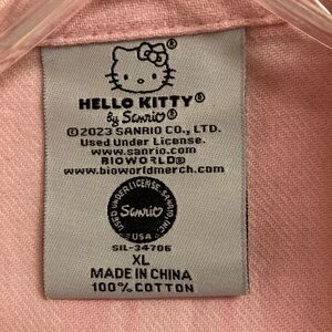 Soft pink & white lightweight flannel button-up boyfriend shirt featuring a bold black Hello Kitty graphic and logo on the back. Simple, playful design. Easy to style for casual wear.