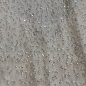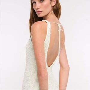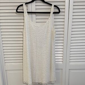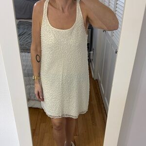 Sleeveless mini dress with scoop neckline. All-over textured beading for subtle sparkle. Straight, shift silhouette with a low back and tie. Versatile for day or evening. Perfect for summer bridal events and bachelorette parties! Worn once and in perfect condition.