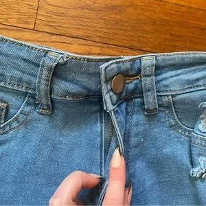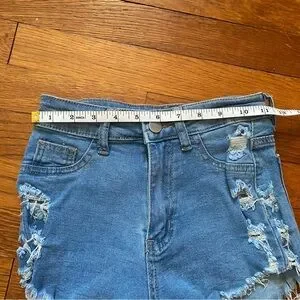 Trendy blue jean shorts with frayed hem. Perfect for casual wear. Stylish and comfortable.
