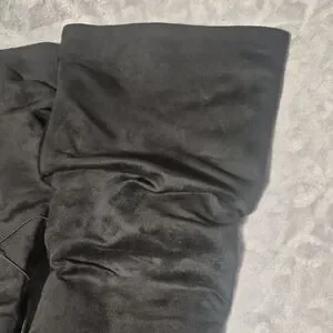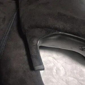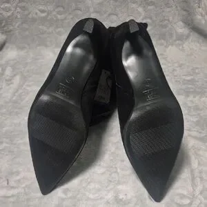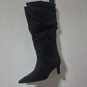 Chic black heeled boots. Faux suede slouch boot. Sleek design with a pointed toe and 2.75" kitten heel. Pull on style with side zipper closure. Ideal for stylish outings. Assorted sizes available