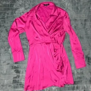 Keywords: Barbiecore, Hot Pink, Satin Mini, Party Dress, Cocktail, Night Out, Ruched, Wrap Front, Vibrant, Glossy, Chic, Modern, Eventwear, Statement Piece