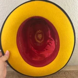 Bruno Capelo Princeton Collection fedora crafted from premium Australian wool. This sophisticated headpiece features a classic black exterior accented by a tonal grosgrain ribbon band and a signature lion logo pin. The interior reveals a striking contrast with a vibrant yellow underbrim and a luxurious red satin lining, showcasing the brand's attention to bold, modern detail. Perfect for adding a dapper touch to formal or casual ensembles, this wide-brimmed hat offers both warmth and timeless style.