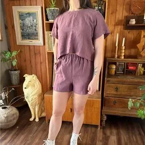 Slow fashion designer Rose Fibers lilac linen set. Top and shorts. Elasticated waist, pockets.