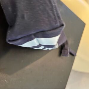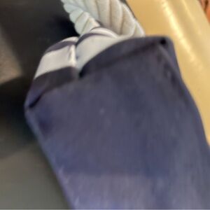 Jean Paul Gaultier toiletry pouch in navy and white stripes. Features a rope wrist strap for easy carry. Top zipper closure keeps contents secure. Compact and stylish for travel or daily use.