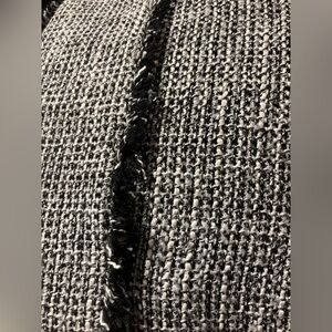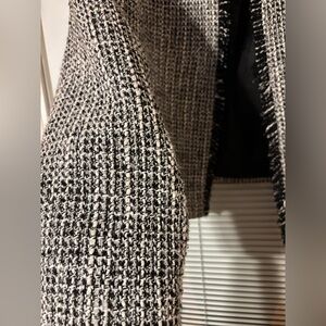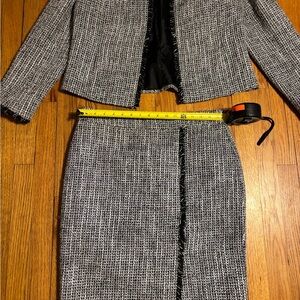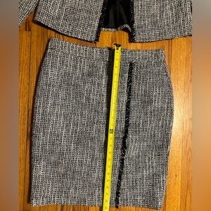 Tailored pencil skirt in classic tweed. Subtle fringe trim along the front seam. Clean, structured silhouette for work or events. Neutral palette pairs with many tops.matching jacket jacket 12 skirt size 10