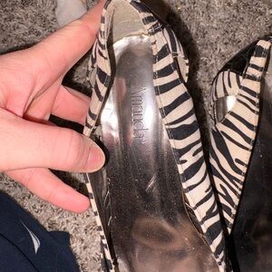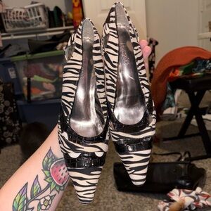 Chic zebra-print pumps with pointed toe and croc-embossed trim. Sleek black and white colorway for versatile styling. Comfortable block heel and polished silhouette for day-to-night wear. Fashion-forward finish elevates dresses and tailored looks.