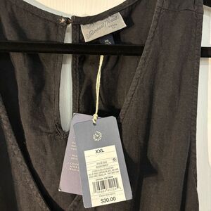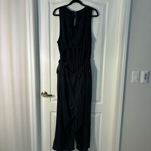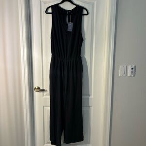 Wide leg Cropped length Keyhold button back closure Cutout back detail V-Neck Sleeveless Side pockets Elastic waist 45% Rayon, 55% Linen