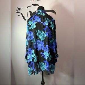 Black Floral Button-Up Blouse in Blue Teal. Semi sheer. Flowy. PTP 26