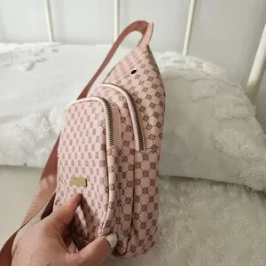 Stylish pink patterned sling bag with gold hardware. Compact design for hands-free convenience. Adjustable strap for a personalized fit. Durable textured material with a front zip pocket for easy access.