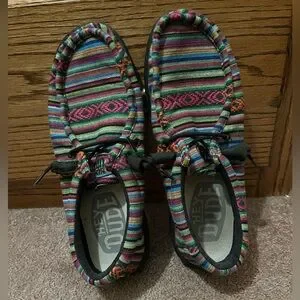 Casual slip-on style with elastic toggle. Vibrant multicolor woven stripes. Soft cushioned footbed for comfort. Flexible sole for everyday play.
