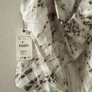 This NWT Zara Voluminous Printed Top Blouse is a stylish and versatile addition to any woman's wardrobe. The sleeveless design and relaxed fit make it perfect for both casual and party occasions. Made from lightweight cotton, this blouse is easy to pack and suitable for all seasons. Available in a classic multicolor print, this blouse in size Small is a must-have for any fashion-forward woman looking for a timeless and comfortable piece.