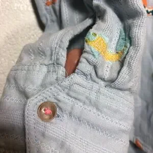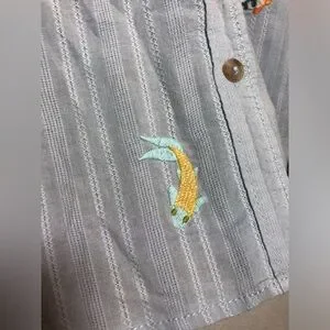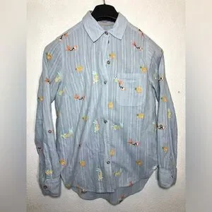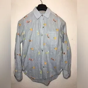 Light blue button-down with embroidered fox and floral motifs. Soft, airy fabric with a relaxed fit. Classic collar and single chest pocket. Roll-up sleeves. Great condition