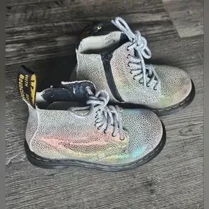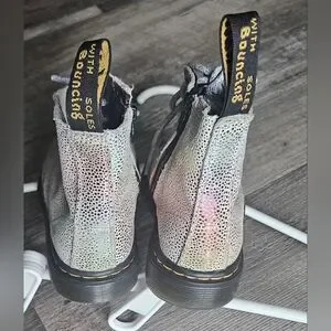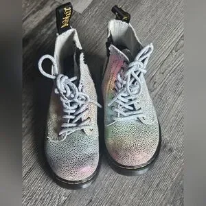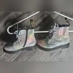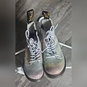 The product is a pair of Dr. Martens zip boots in size 8, specifically designed for girls. These multicolored combat-style boots feature a zipper closure, making them easy to put on and take off. Perfect for all seasons, they offer durability and style for young girls looking for a versatile footwear option.