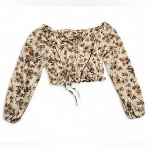Chic off-shoulder blouse with floral design. Features cream and pink tones. Ideal for casual outings.