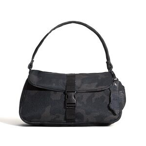 Sleek black camo handbag with coin purse for everyday wear. Lightweight and versatile with a secure front buckle closure, shallow inner zip pocket and a single strap for easy carrying. Subtle camo pattern adds a modern edge to any outfit.