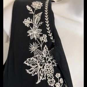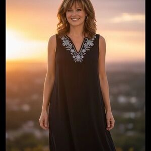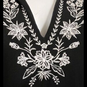 This Lands' End women's size M cotton black embroidered white floral shift dress is perfect for travel and casual occasions during the summer and spring seasons. The sleeveless dress features a V-neckline, pullover closure, and side hem slits for added style. Made from comfortable cotton material, this dress is adorned with embroidered white floral accents, giving it a unique and feminine look. Ideal for women who appreciate a relaxed and elegant shift dress with a floral theme.