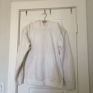 Soft cream pullover hoodie with a relaxed fit. Features a kangaroo pocket and a comfortable hood for casual layering. Versatile cream color pairs easily with any wardrobe.