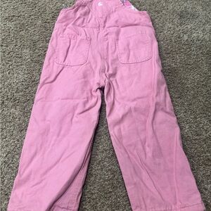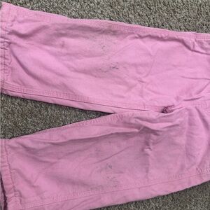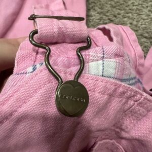 Carhartt cotton overalls in pink with plaid trim. Adjustable metal hardware and front bib. Classic workwear silhouette with visible label.