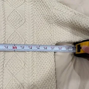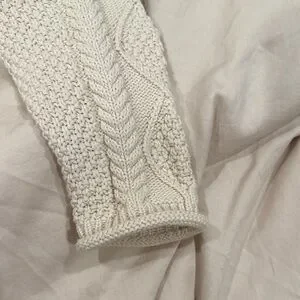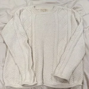 Tradlands 100% Cotton cable knit sweater in a soft cream color, with a loose thread at the shoulders. Otherwise a lot of life left!