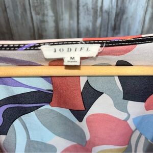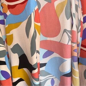 Add a bold splash of color to your wardrobe with this Jodifl kimono cardigan in (an oversized) size Medium. Features a vibrant abstract leaf and floral print in coral, mustard, lilac, aqua, black, and blush pink. Lightweight and airy with wide 3/4 sleeves and an open front, this versatile layering piece is perfect for summer festivals, casual weekends, or creative workwear. Fabric is 100% polyester with a soft drape. Excellent preowned condition, no flaws noted. Flat lay approx measurements: • Length: 37.5” • Sleeve Length: 16” artsy kimono cardigan, dopamine dressing layer, summer festival outfit, flowy, beachy, maximalist print coverup, colorful boho chic, bold abstract wrap, beach, poolside, creative closet staple, art to wear, bohemian, colorful kimono, layering piece, bold print, oversized, long line