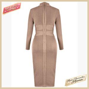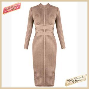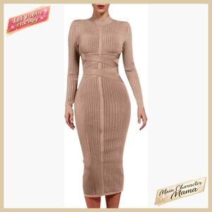 Cross Strap Ribbed Bandage Bodycon Midi Dress Long Sleeve Fall Party Wear