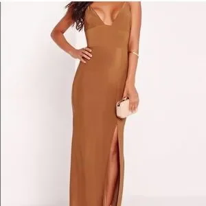 This stunning brown maxi dress by Missguided is perfect for a cocktail night out. Featuring a daring plunge neckline and a high slit, it offers a sleek bodycon fit that accentuates your silhouette. Missguided brand. Only worn once. US size 6. Stretches so can fit larger/smaller sizes depending on desired fit.