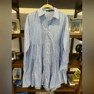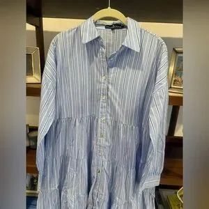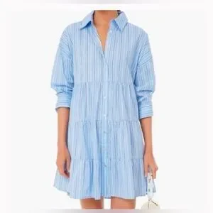 TUCKERNUCK Shades of Blue Striped Cara Dress - Women’s Size small - 100% Cotton - Pomander Place - pinstripe pattern with a tiered silhouette - drop shoulder - high low hemline