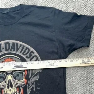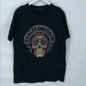 Authentic Harley-Davidson graphic T-shirt featuring a bold skull biker graphic on the front and a detailed pin-up motorcycle illustration on the back.