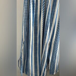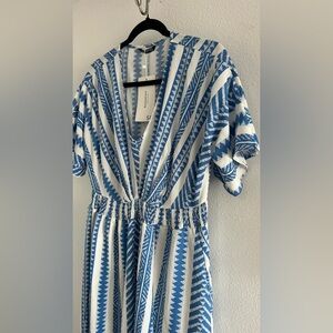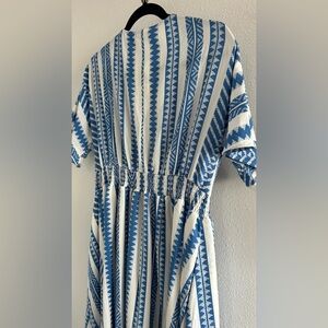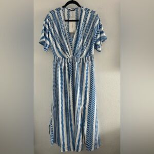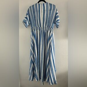 Floaty maxi dress with bold vertical blue and white stripes. Deep V-neck and short sleeves. Elastic waist for a defined silhouette. Lightweight, breezy fabric for warm days.
