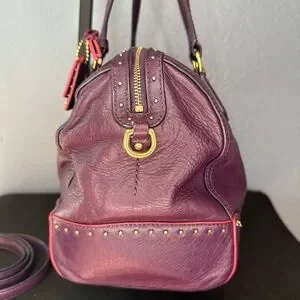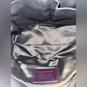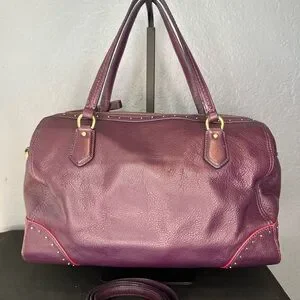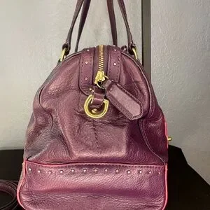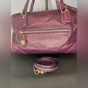 This Coach Poppy Satchel is a structured rectangular "East/West" bag featuring distinctive gold-tone stud detailing along the top zipper area and sides. Crafted from a gorgeous purple leather with satin interior lining, this bag is the perfect for daily use! The plum purple color is gorgeous and the leather is sift and squishy!