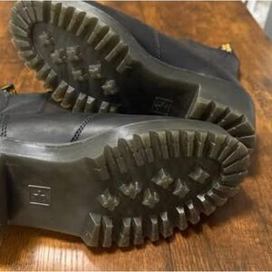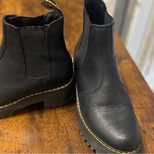 New without Tags -Classic Dr. Martens Chelsea boots. Smooth black leather upper with elastic side panels. Signature yellow welt stitching and lug sole. Sleek, versatile style for everyday wear.