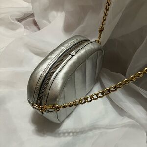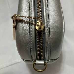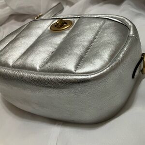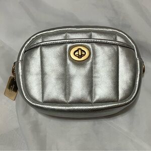 Coach camera bag silver quilted soft calf leather with pearl finish style H2139 C6618. Turnlock closure with front slip pocket. Zipper is missing a pulley; but is easy to open and close/functional as is. Good pre owned condition.7 3/4" (L) x 5 3/4" (H) x 2 1/2" (W).