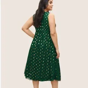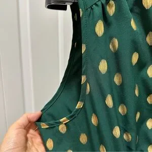 Sleeveless V-neck midi dress. Fitted waist with a full skirt. Gold dot print on emerald green fabric. Side pockets. Lightweight and flowy. Versatile for day or evening wear.
