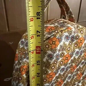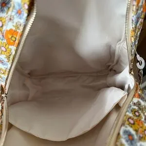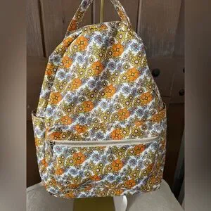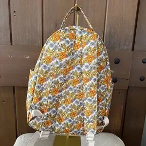 Stylish floral backpack featuring vibrant orange and yellow hues. Perfect for adding a pop of color to any outfit.